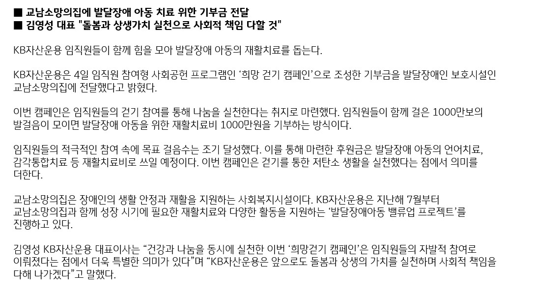 KB자산운용, 임직원 동참 '희망 걷기 캠페인' 발달장애아동 재활치료 돕는다.